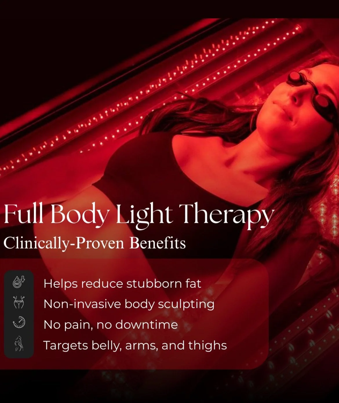 Red Light Therapy is a safe, non-invasive treatment that uses low-level wavelengths of red and near-infrared light to stimulate cellular repair, reduce inflammation, and boost collagen production. It’s a versatile treatment used for skin rejuvenation, fat loss support, muscle recovery, and overall wellness.